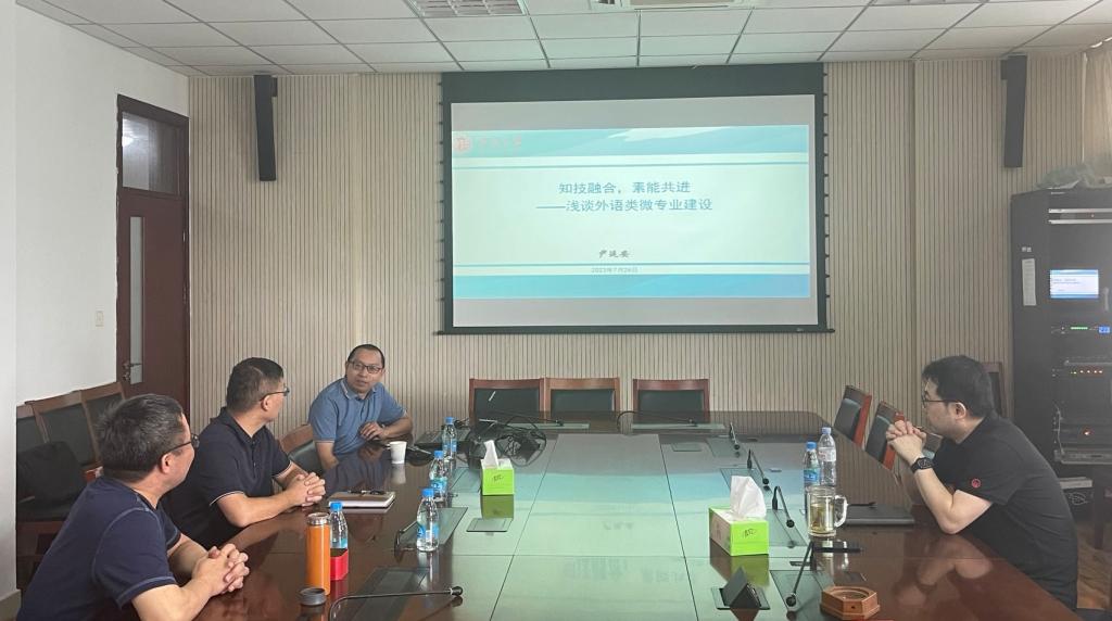7月24日上午,常州大学外国语学院副院长尹延安教授来我院交流微专业申报经验。綦亮副院长(主持工作)、刘新芳副院长、苏章海教授和赵诚博士参加了交流活动。