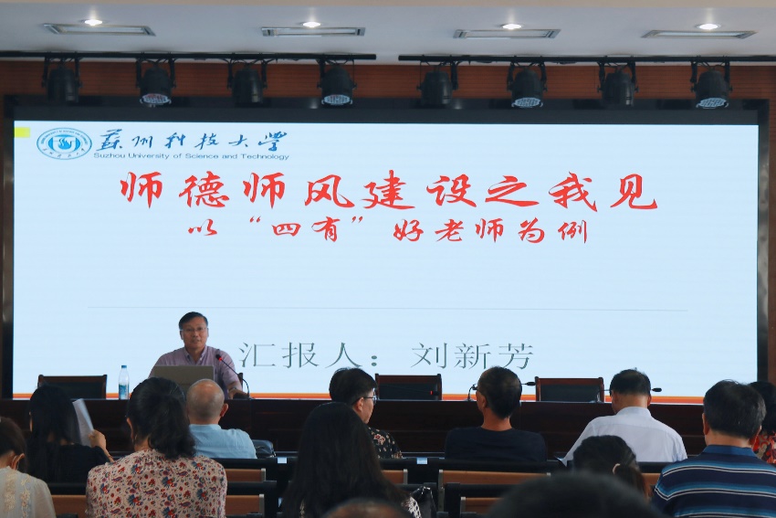 师德师风建设是学校教师队伍的核心,是端正教风,强化凝聚力的关键。为扎实推进师德师风建设,引导教师自觉遵守职业道德规范 ,7月5日下午苏州科技大学外国语学院召开师德师风教育专题讲座,刘新芳副院长围绕“师德师风建设之我见——以‘四有’好老师为例”这一主题开讲。
