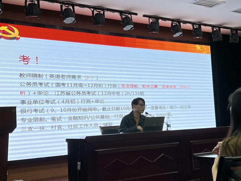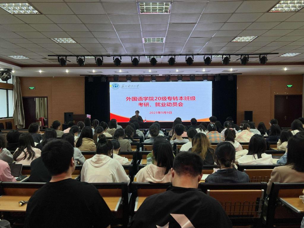 为做好我院2020级英语专转本学生考研、就业指导工作,帮助2020级学生提前了解考研、就业形势及状况,提高就业和考研升学的积极性,树立正确就业择业观。2023年5月9日下午18时30分,我院夏云康老师在C2-五楼报告厅举办了外国语学院2020级英语专转本班级考研、就业动员会。
