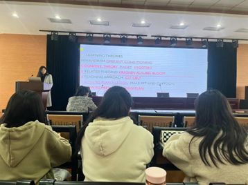 杨老师从三个方面展示了如何进行教学设计以及说课,即丰富的教学理论知识、教学的实践能力以及信息技术的应用能力。教学设计和说课必须要从理论出发,常见的理论包括:强化理论、皮亚杰的认知发展四阶段、最近发展区、克拉申的五大假说、奥苏贝尔的有意义学习以及布鲁姆的目标分类学。教师需要在理论的指导下不断完善教学设计。首先教师需要备课标、课本、文本和学情,从而确立教学目标及重难点。在此基础上,层层递进设计教学活动。同时,板书的设计也尤为重要,尤其要注意板书的逻辑性。讲座最后,杨老师向大家展现了如何将信息技术应用到实践教学中。信息技术在教学实践中扮演着越来越重要的角色,在教学中恰当地使用信息技术可以大大提高学生的学习兴趣。