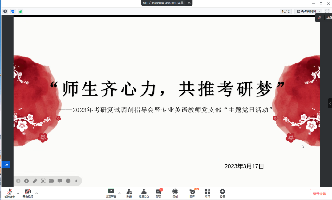 3月17日19:00,苏州科技大学外国语学院专业英语教师支部顺利举办2023年“师生齐心力,共推考研梦”考研复试调剂指导会。本次会议由支部书记蔡隽老师主持,邀请支部近十位党员老师分享指导经验,旨在为学生考研复试和调剂提供切实有用的针对性指导,提高学院考研升学率。