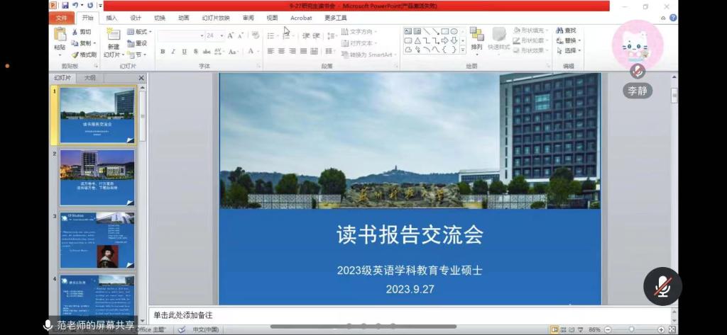 9月27日下午,外国语学院23级教育硕士第一次读书沙龙分享会顺利开展。本次分享会由范丽娟教授指导,共六名学生进行了读书分享,24名教育硕士全体参与。