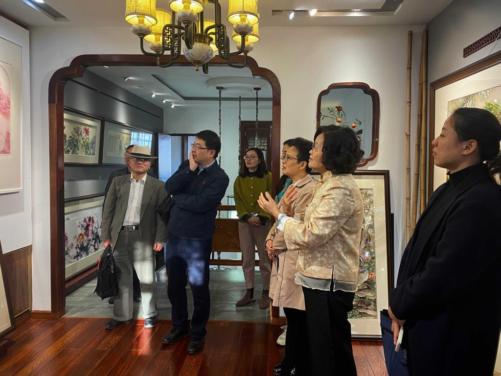 调研组一行与高新区统战部的领导们进行了座谈交流,围绕强化正向思想引领、深化校地合作、加强平台阵地建设、发挥各界热心人士作用等方面深入探讨交流。袁晓月部长对调研组一行表示热烈欢迎,希望与苏州科技大学外国语学院加强联系对接,不断深化各领域合作,共同推动统战工作高质量发展。随后,调研组一行先后参观了农工党之家苏州高新区基层委员会阵地和致公之家姚琴华刺绣艺术馆。调研组在两个阵地深切感受到以“民主党派”为纽带,以“文化传承”为载体,以“双向服务”为目标,积极弘扬中国传统文化的氛围和奉献精神。
