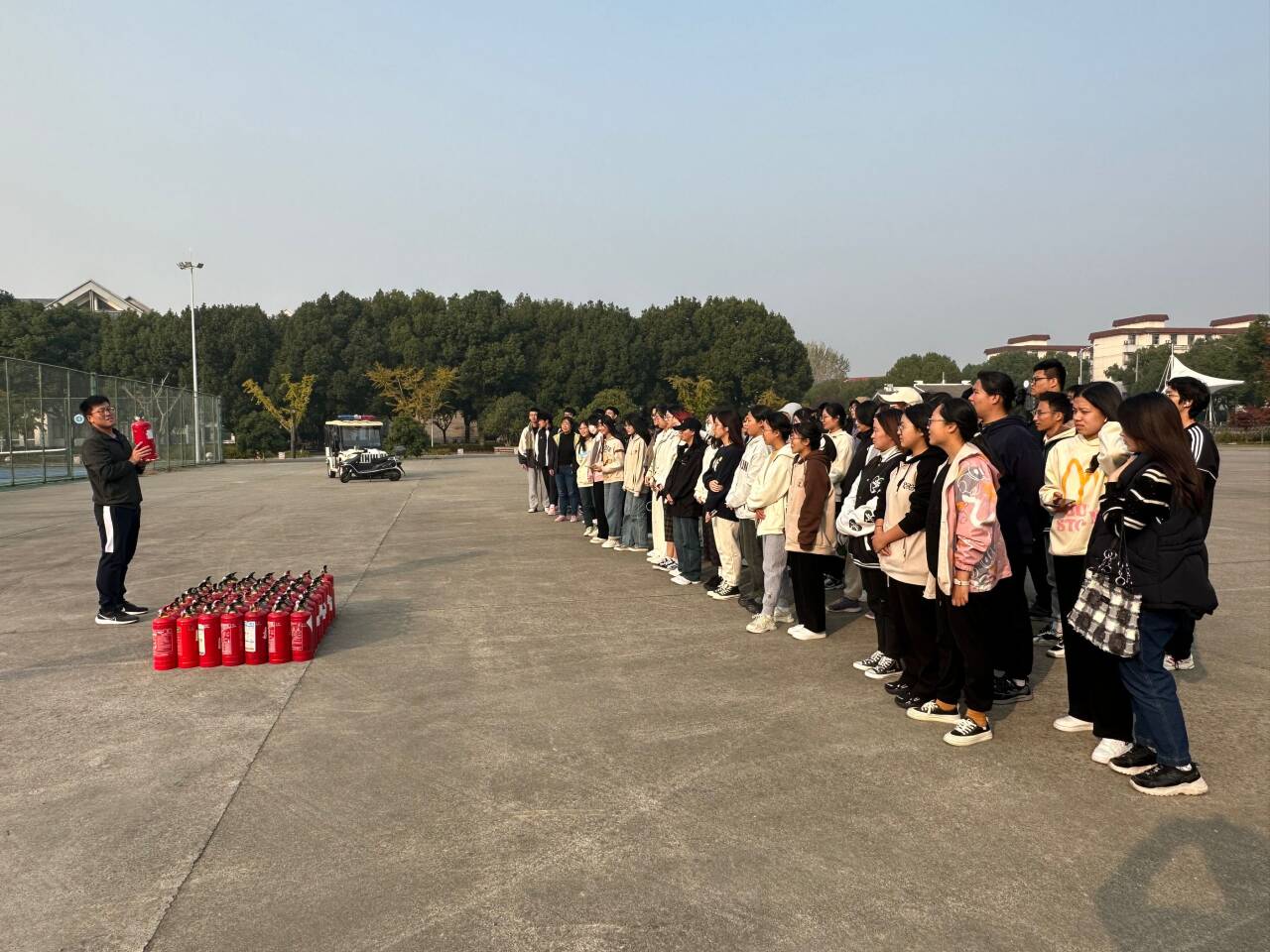 在宣讲结束之后,外国语学院的老师带领同学们前往空旷场地进行实际操作。老师先进行了示范与讲解灭火器的使用,方法归纳成“提拔握压”四字,方便同学们理解与记忆。在观看完老师的指导后,同学们自行分组进行灭火实践。