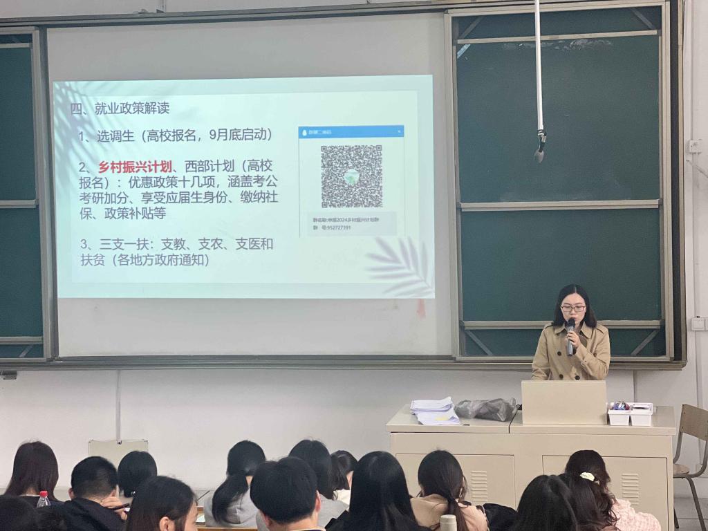 宣讲会上,陈老师详细介绍了西部计划和乡村振兴计划的报名方式和具体工作,以加深同学们对西部计划和乡村振兴计划的了解。在进行政策解读时,陈老师围绕“乡村教育” “服务乡村建设” “健康乡村” “基层青年工作” “乡村社会治理” “卫国戍边” “服务新疆” “服务西藏” 等八个专项内容展开,引导和鼓励同学们积极融入基层,投身乡村,践行志愿服务精神,贡献青春力量。随后,陈老师介绍了我院学生的历年录取情况,动员同学积极报考,而全体辅导员老师也将继续跟进宣传与报名工作,助力同学参与西部计划和乡村振兴计划。