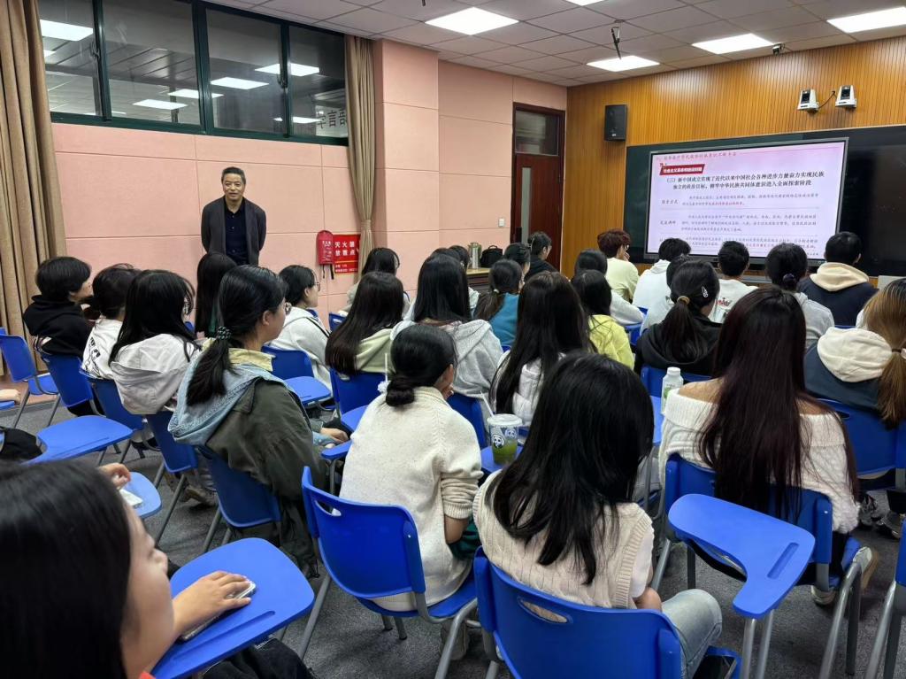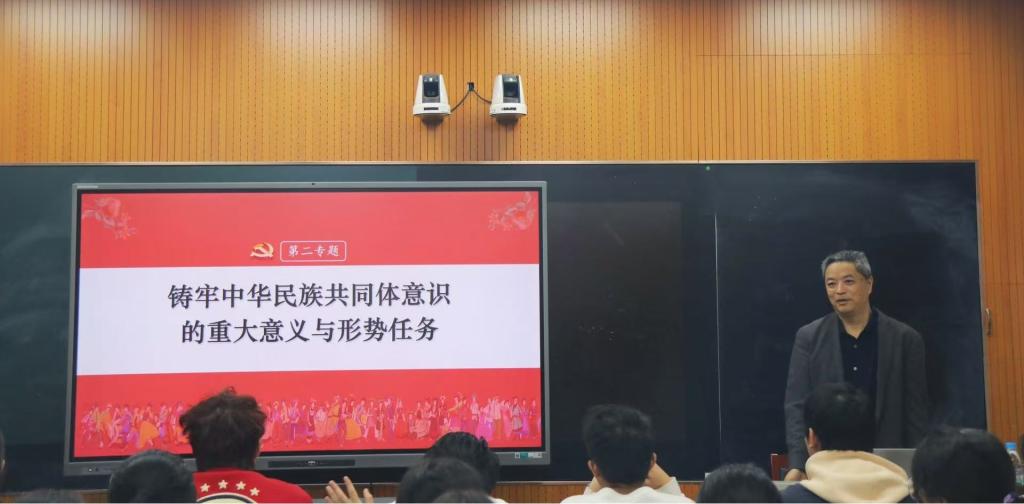 张书记生动阐述了中华民族共同体意识的内涵与实质。带领同学们回顾了百年来中华民族共同体意识不断丰富的过程,解析了当前时代背景下铸牢中华民族共同体意识的历史必然性、极端重要性和现实针对性,明确了未来的发展战略。在讲述过程中,张书记通过鲜活的实例展示了我们党和国家在推动铸牢中华民族共同体意识的过程中如何落到实处的。学生们认真聆听,现场课堂气氛活跃。