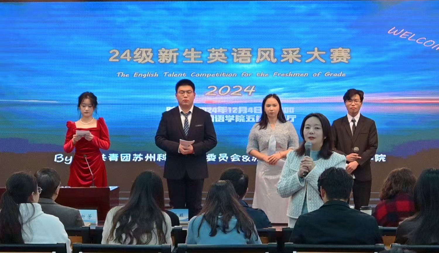 2024年12月4日,由校团委和外国语学院联合举办的新生英语风采大赛在外国语学院五楼报告厅拉开帷幕。校团委副书记周思颖、外国语学院院长綦亮、副院长刘新芳出席大赛开幕式。本次大赛由外国语学院院长助理王妍主持,外国语学院大外部和英语系的教师、全省全国英语竞赛获奖学生受邀作评委。