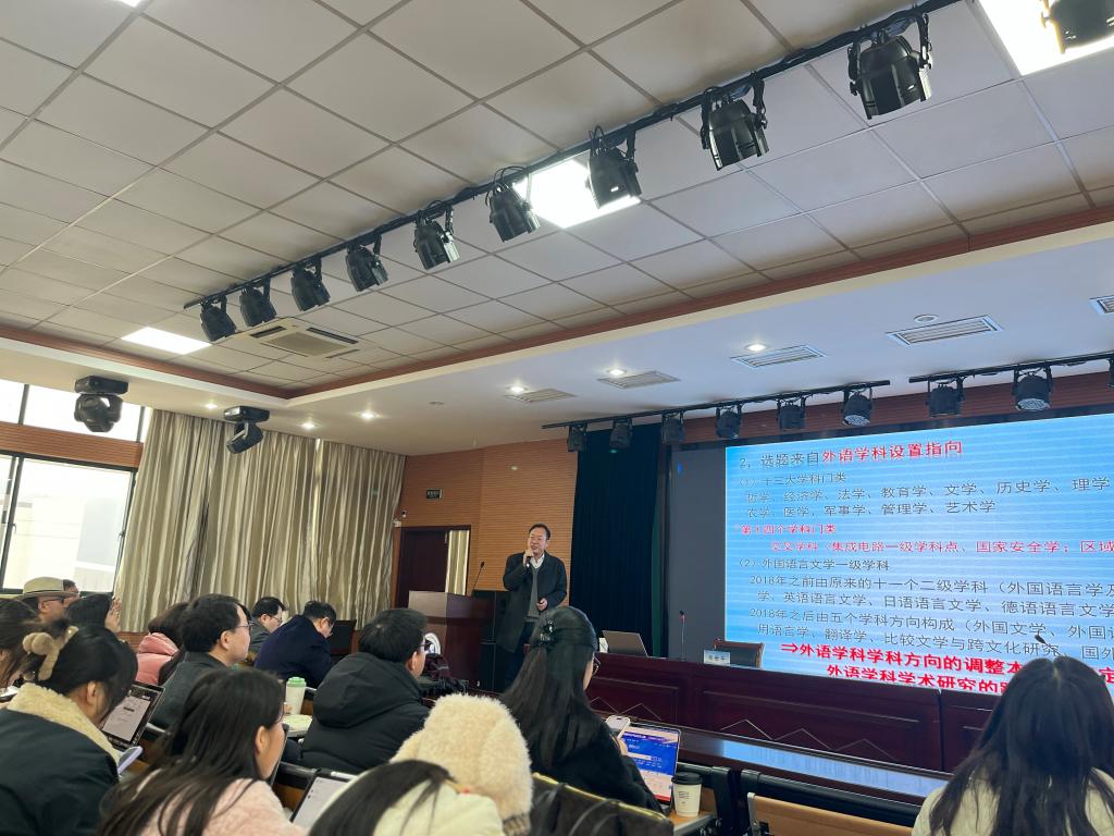 近日,南京工业大学外国语学院院长陈世华教授莅临学院指导工作,开设“外语教师跨学科研究思维:来源与视点”学术讲座。学院副院长(主持工作)綦亮教授主持讲座,学院学术带头人、骨干教师以及全体研究生参加学习。