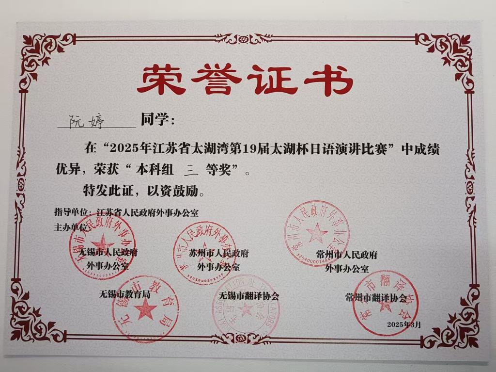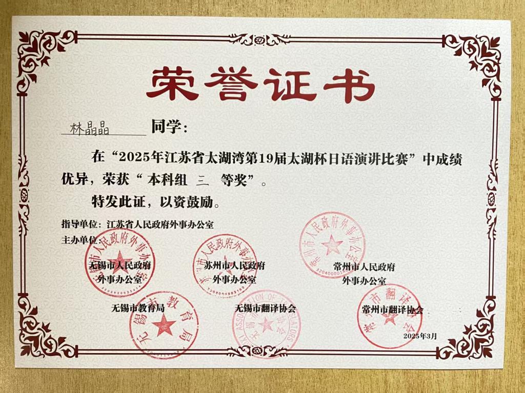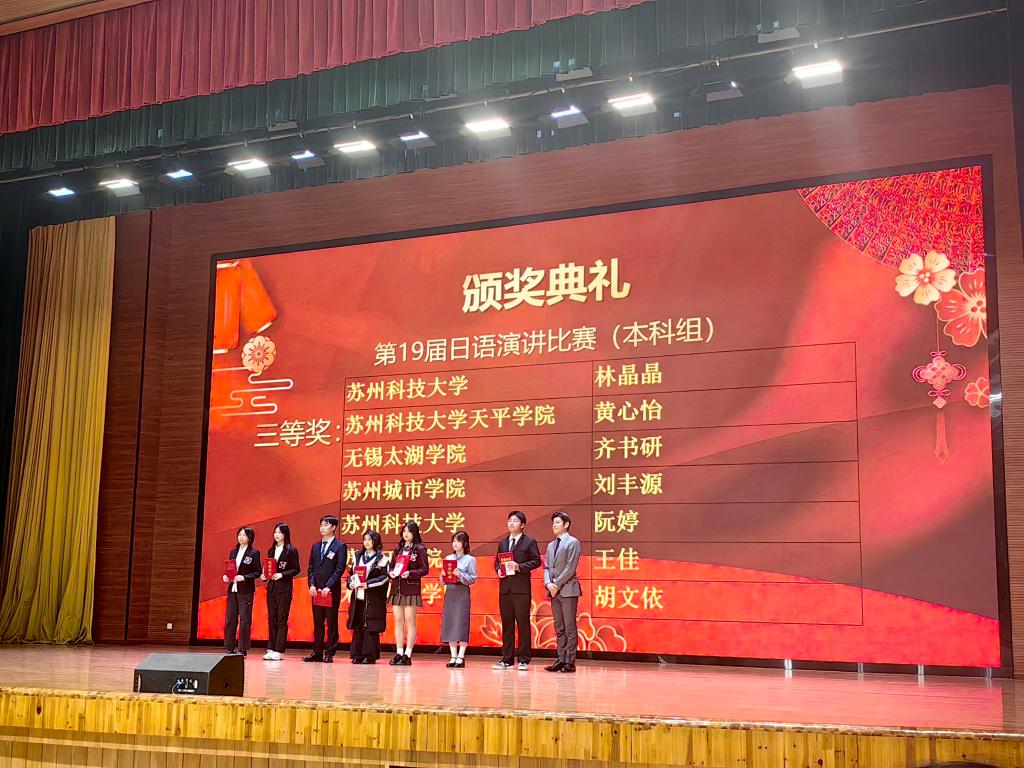 比赛吸引了苏锡常湖州等环太湖地区高校学生及社会人士参与,延续本科组、专科组、社会组的分组赛制。本科组共有21名选手晋级决赛,经过现场演讲、问答等环节的激烈比拼,我院日语系2023级学生林晶晶、阮婷表现出色,荣获“本科组三等奖”;指导教师郭璇、新野雅子、三原朱理获评“优秀指导教师奖”;苏州科技大学获“优秀组织单位”称号。