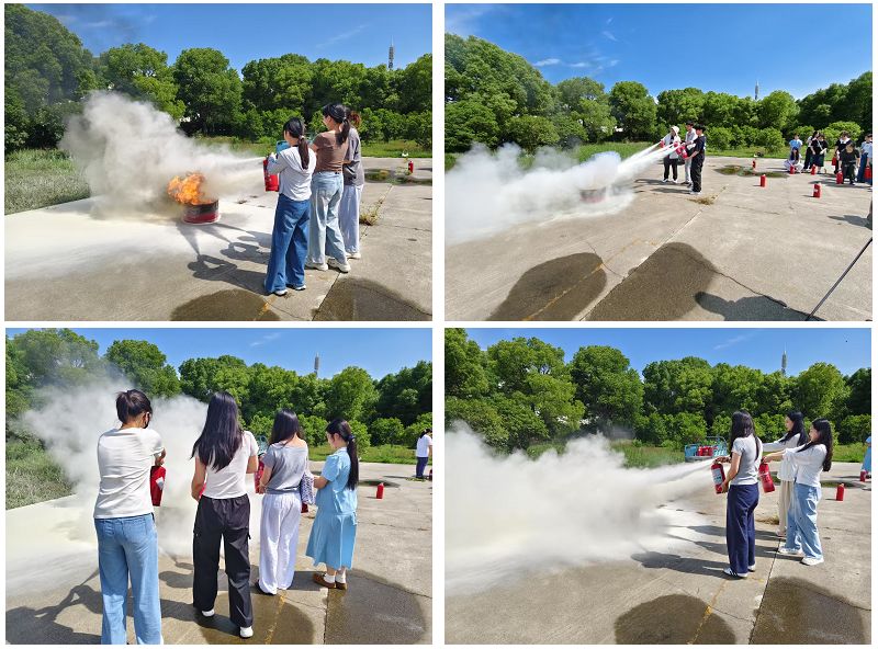 培训结束后,师生们来到操场参与消防实操演练。卢科长现场示范灭火器“提、拔、握、压”的使用口诀,并指导大家进行灭火实操。在模拟火情环境下,师生们依次上手操作,成功扑灭模拟火源,切实掌握了灭火器的使用技能。