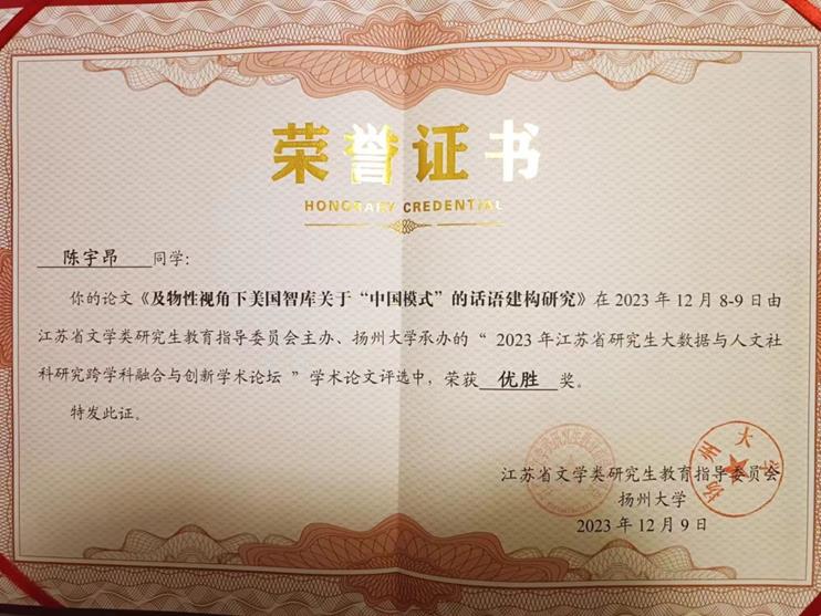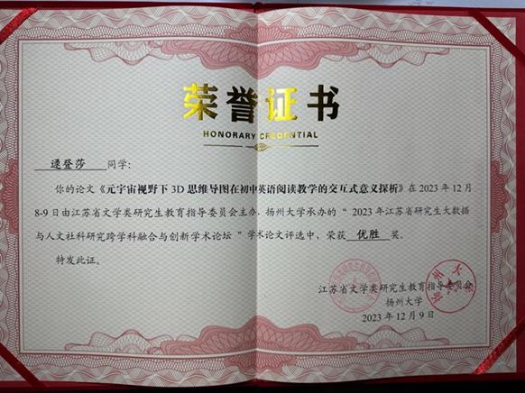 本次论坛的主题是“大数据与人文社科研究跨学科融合与创新”,包括论文征集、专家讲座、分论坛报告、论文评优表彰等。论坛分别邀请了南京师范大学的许多教授、扬州大学的朱毅教授、苏州大学的孟祥春教授、扬州大学的王金铨教授作了主旨报告,“大数据时代文学翻译的守正——以罗慕士《三国演义》全译本中的刘备形象为例”、“基于预训练语言模型的自然语言处理”、“人文学术创新与话语构建”、“基于大数据的翻译质量量化评价研究”。分论坛有“二语习得与外语教学研究”、“话语分析研究”等。来自南京大学、东南大学、南京师范大学等十余所高校,近50名优秀博士生、硕士研究生代表参加。我院刘新芳教授主持了两场主旨报告和一个研究生分论坛,我院学科教学(英语)研究生徐欣芸、逯登莎、陈宇昂在分论坛作了汇报,汇报内容获得专家们一致好评。徐欣芸、逯登莎、陈宇昂三人提交的论文分别获得二等奖和优胜奖。