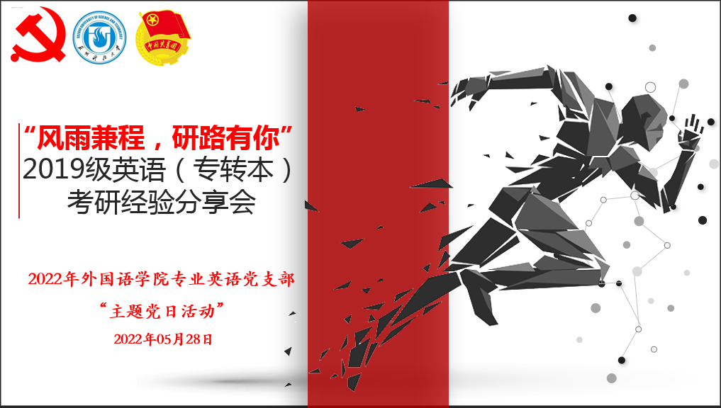 5月28日19:00,苏州科技大学外国语学院专业英语教师支部顺利举办2022年“风雨兼程,研路有你”主题党日考研经验分享会。本次会议由支部书记蔡隽老师主持,邀请支部近十位老师分享指导经验,旨在引导学生树立正确考研目标,推进外院考研工作高质量发展。