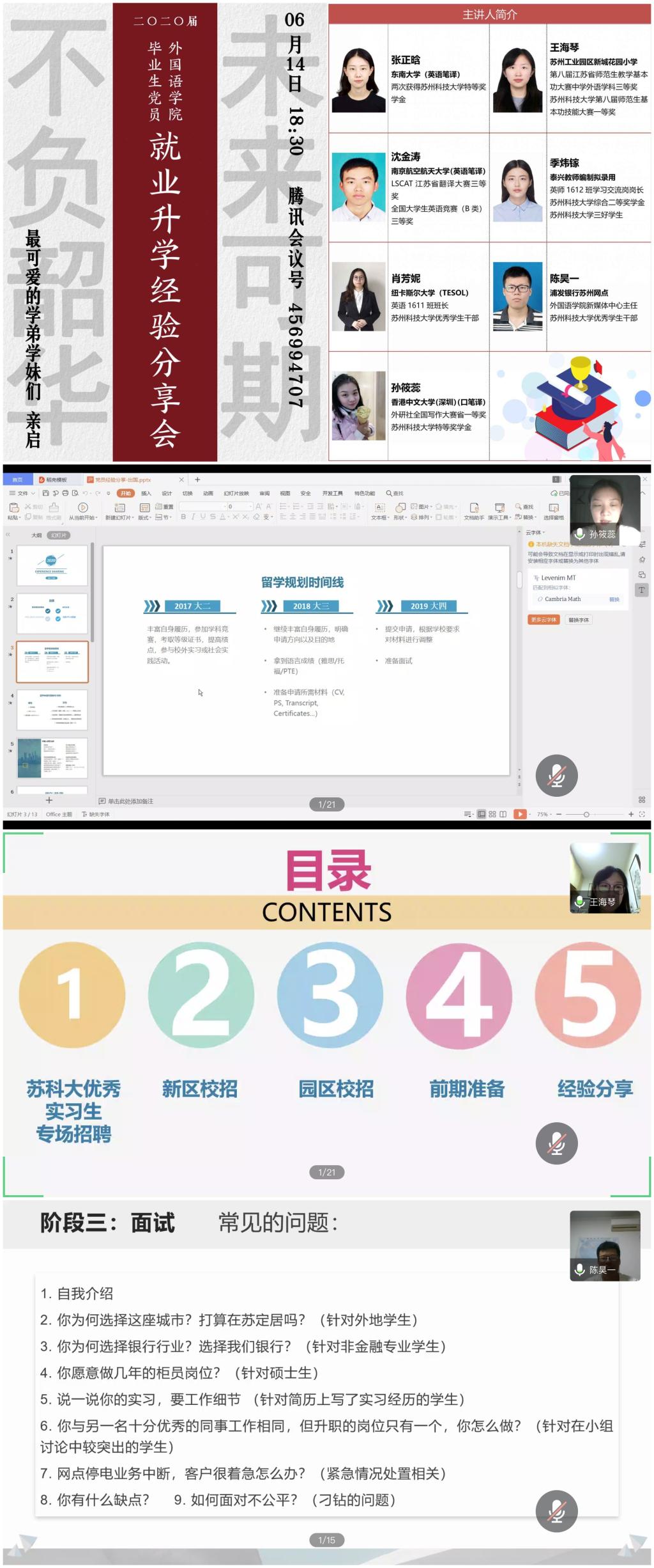 2020年6月14日18:30外国语学院通过腾讯会议举办了“未来可期,不负韶华”2020届毕业生党员就业升学经验分享会。外国语学院优秀党员代表张正晗、沈金涛、肖芳妮、孙筱蕊、王海琴、季炜镓、陈昊一作为此次活动的主讲嘉宾,活动由学生英师支部党员刘泽慧主持。此次会议旨在向学弟学妹们分享就业升学经验,帮助他们来年能够更好地找到自己的发展方向。
