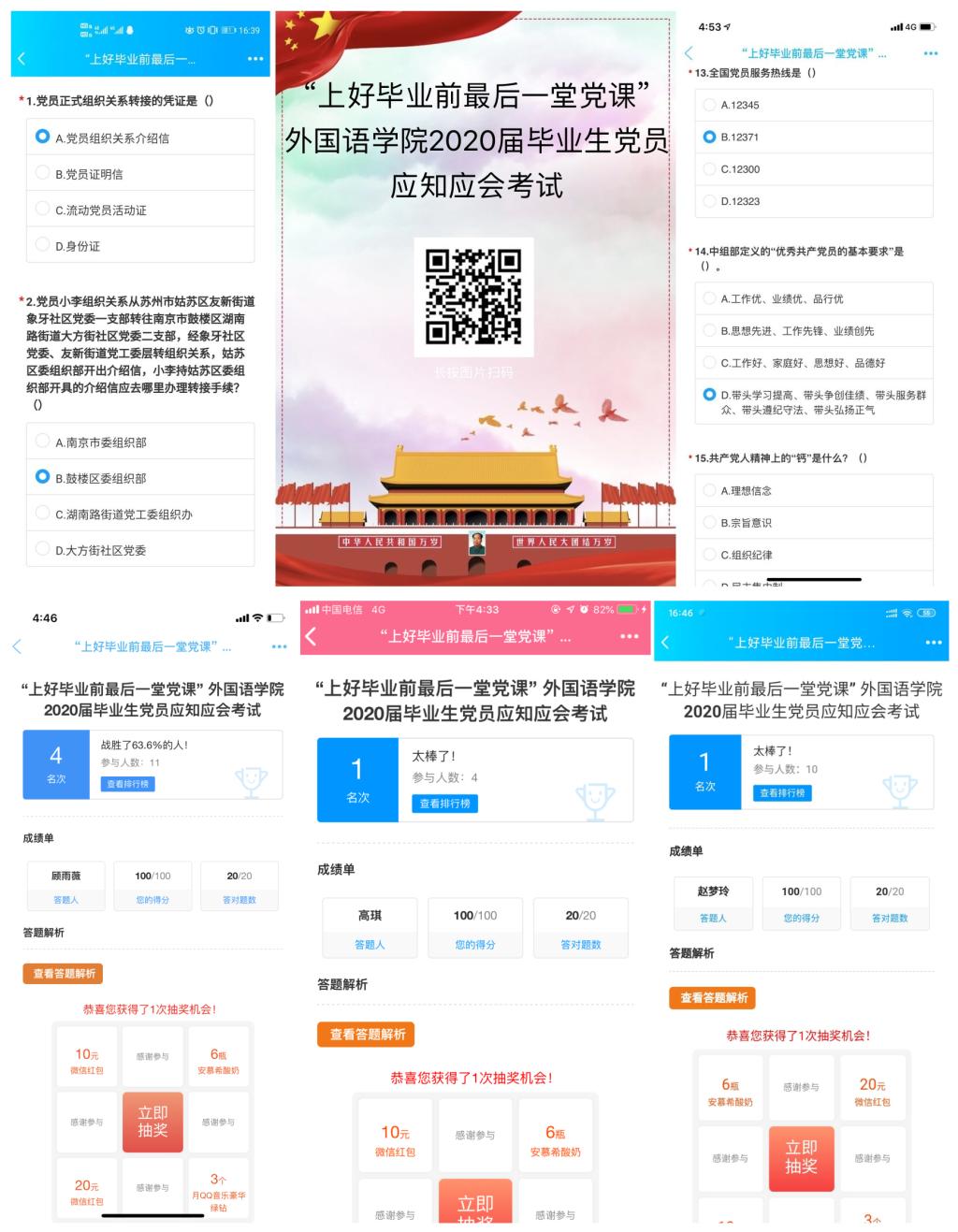 2020年6月11日下午,外国语学院全体毕业生党员通过问卷星平台参加了“上好毕业前最后一堂党课”毕业生党员应知应会考试。此次考试主要包括三方面内容,一是党的理论知识,二是时事政治,三是党组织关系转接。