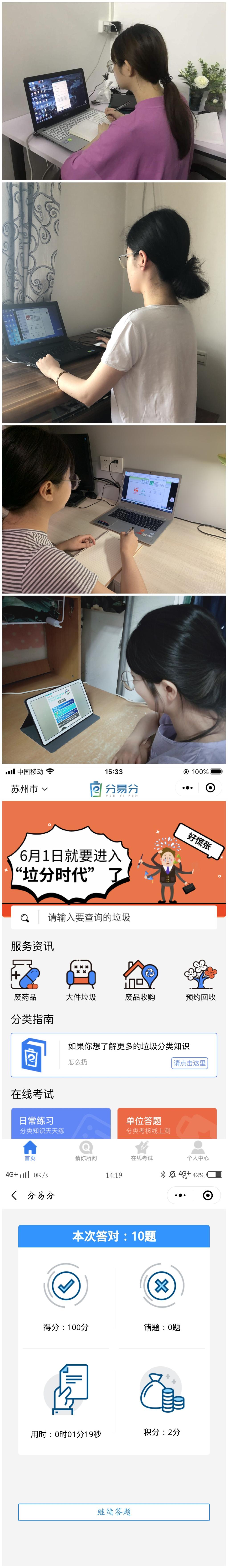 会议通过“分易分”微信小程序开展线上学习和测试,各位党员在线学习垃圾分类相关知识,阅读垃圾分类指南,结合城市特色了解苏州市生活垃圾分类常规问题、条例处罚问题以及分类垃圾处理相关问题,并学习垃圾分类小常识。在一系列线上学习结束之后,党员们以在线测试的形式,完成“分易分”小程序内的“日常练习”,巩固垃圾分类知识。会议最后,党员们在微信群内交流学习心得。党员代表陈帆指出,通过此次活动,她学到了许多有关垃圾分类的小常识,科学合理的解释带她走出了垃圾分类的误区,还帮助她掌握了对不同类型垃圾处理的基本操作,同时也意识到了要全面实行垃圾分类的重要性,受益匪浅。