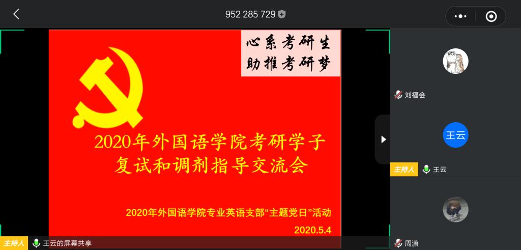 为应对新冠肺炎疫情对考研学生的影响,帮助考研同学初试成绩公布后能够找到正确的努力方向,了解资讯,从容应对考研调剂与复试,5月2日下午与5月4日上午,我院面向2016级考研学生分别举办了考研调剂线上交流会与考研复试线上指导会。调剂交流会由院长郭富强主持召开并做指导,根据考研成绩需进行调剂的同学参加会议,复试交流会由教工专业英语支部书记王云老师主持,学院领导、专业英语支部教工党员、辅导员和16级考研学生参加了会议。