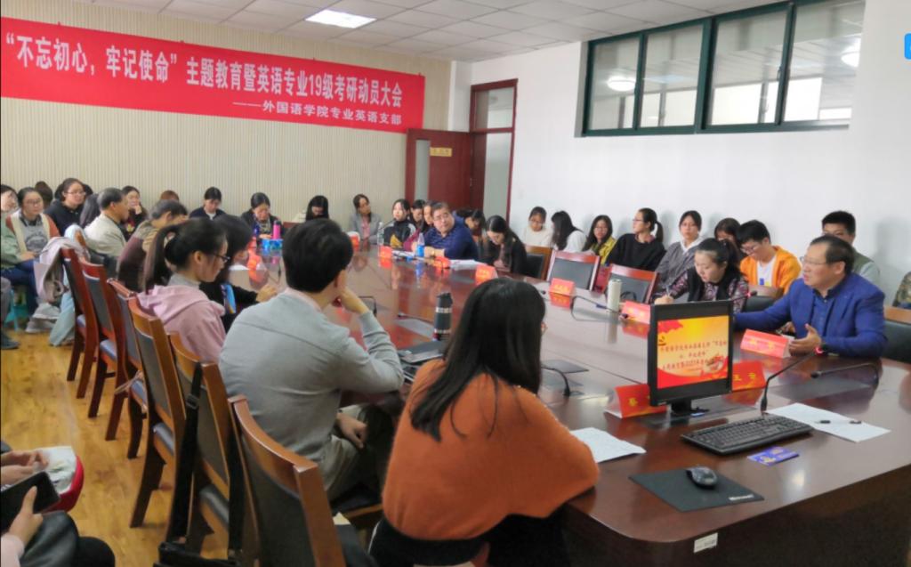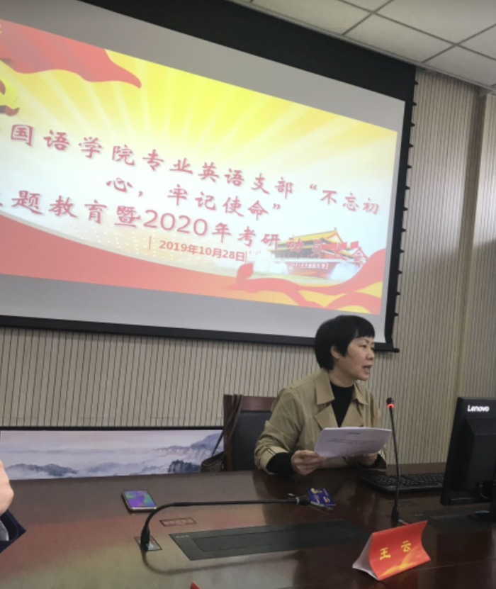 2019年10月28日中午12:30,苏州科技大学外国语学院专业英语支部在C2-308召开了“不忘初心,牢记使命”主题教育暨2020年考研动员大会。会议由支部书记王云主持,参会人员包括支部党员14人、有考研意向的同学们以及首届学科教育英语硕士代表朱梦晨和常雪梅。会议内容共四个部分: