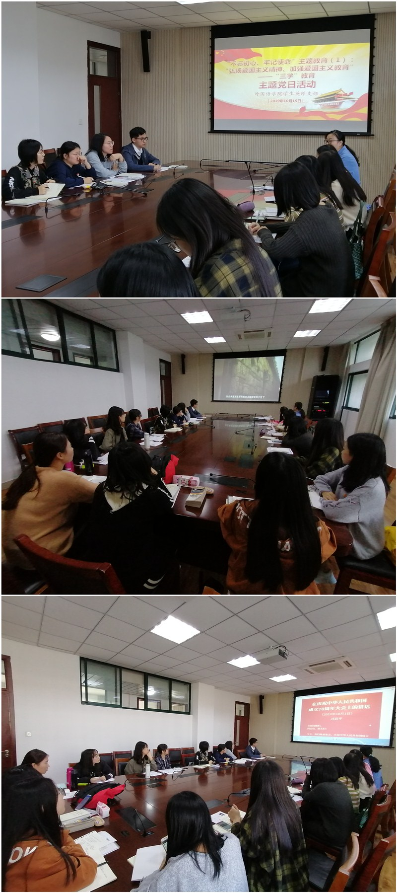 2019年10月15日下午,外国语学院学生英师支部在C2-308召开了“三学”教育主题党日活动。全体党员参加了此次活动,活动由支部书记周茹老师主持。本次活动以“弘扬爱国主义精神、加强爱国主义教育”为主题,以“三学”教育为主要内容,旨在深化全体党员对“三学”内涵的认识,学习时代楷模精神,树立爱国主义信念。
