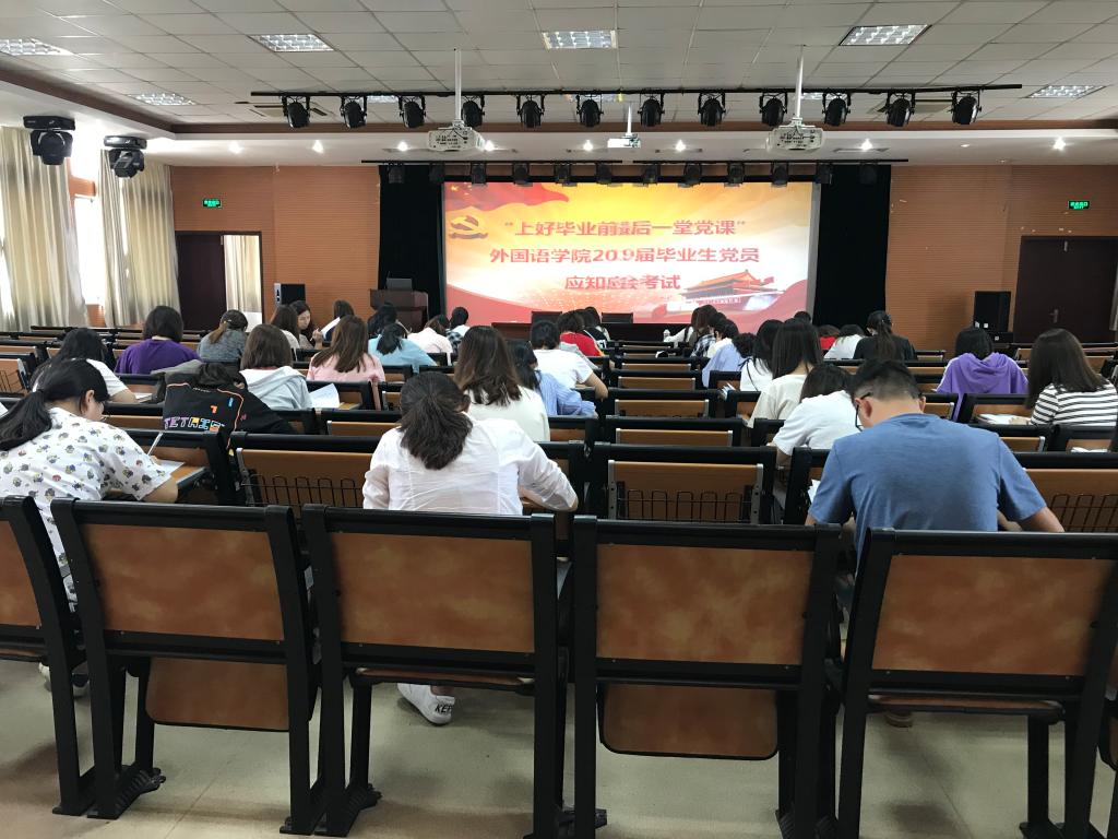 2019年6月3日上午,外国语学院全体毕业生党员在C2-308参加了“上好毕业前最后一堂党课”毕业生党员应知应会考试。此次考试主要包括两方面内容,一是党组织关系的转接,二是党的知识理论。