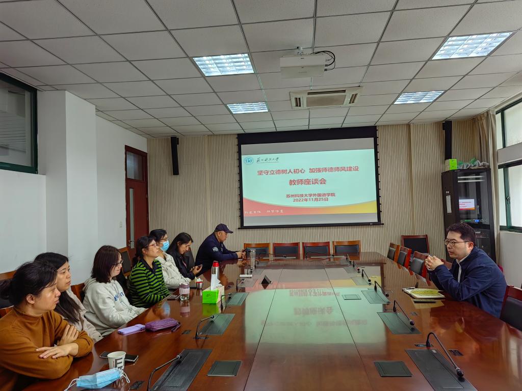 11月25日上午,外国语学院在C2-308会议室召开师德师风教师座谈会。会议由外国语学院副院长(主持工作)綦亮主持,学院各系部教师代表参加座谈会。綦亮传达了学校乐鱼网页版师德师风建设相关精神,通报了学院师德师风建设工作情况,领学了《乐鱼网页版加强和改进新时代师德师风建设的意见》《新时代高校教师职业行为十项准则》。通过座谈会向各位参会教师了解当前学院师德师风建设方面存在的问题,并听取教师的意见和建议。本次座谈会,有效提升了教师对师德师风建设的思想认识,有助于提升教师队伍思想政治素质和职业道德水平。