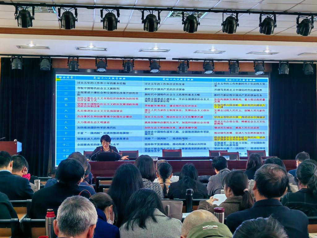 11月16日下午,外国语学院邀请苏州大学马克思主义学院副院长、江苏省中共党史学会理事朱蓉蓉教授作党的二十大精神专题宣讲。宣讲在C2五楼多功能报告厅举行,由外国语学院党委书记姚之彦主持,学院全体教职工及学生党员参加。朱蓉蓉以《全面推进中华民族伟大复兴的政治宣言和行动纲领--深入学习贯彻党的二十大精神》为题,从“踔厉奋发、迈向新征程,勇毅前行、擎画新蓝图,知行合一、勇担新使命”三方面,细致阐述了如何深入领会和贯彻党的二十大精神。在党的自我革命和全面从严治党方面做了重点辅导,全面讲授了党的二十大通过的《中国共产党章程》,特别对新党章修订的50处内容与2017年版党章做了详细对照讲解。朱教授的宣讲有利于学院师生进一步夯实党纪法规理论基础,筑牢廉洁思想防线。