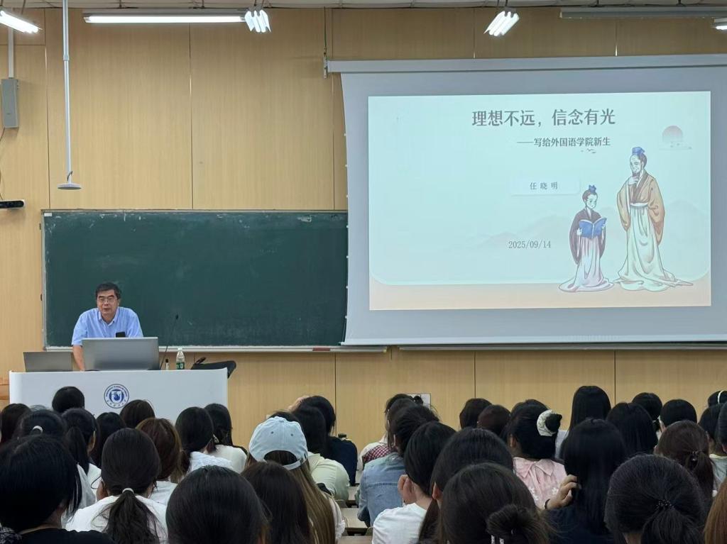 9月14日上午10:30,外国语学院在天平校区J1阶梯教室成功举办2025级新生理想信念教育专题讲座。任晓明老师以“理想不远·信念有光”为主题,为新生带来了一场深刻而动人的精神洗礼,通过优秀校友的成长历程,激励新生坚定专业信念,树立远大人生目标。