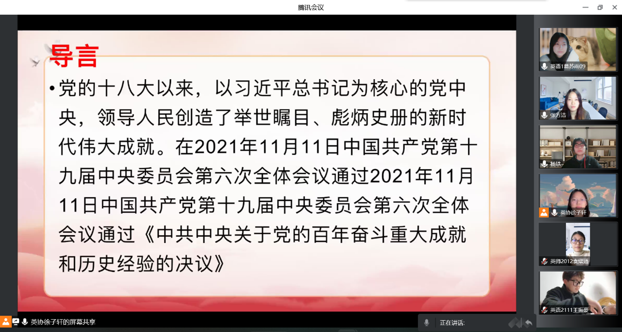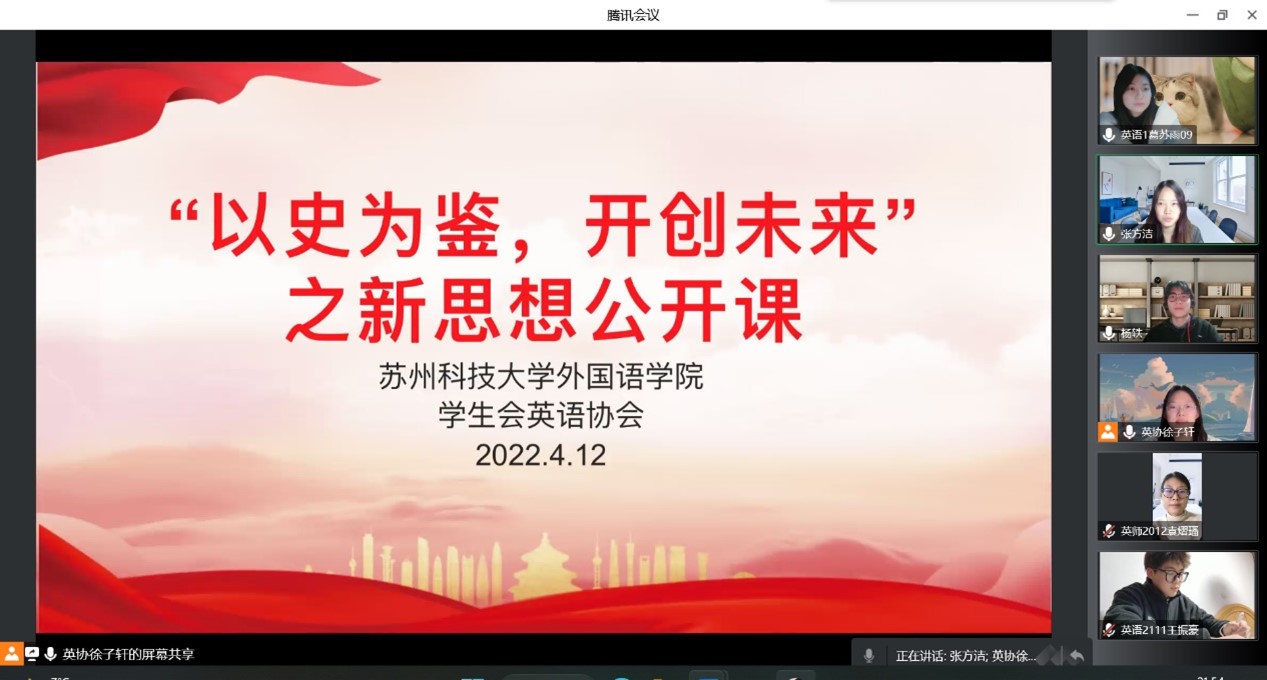 2022年4月12日20:30,苏州科技大学外国语学院学生会英语协会在腾讯会议举办了线上的“以史为鉴、开创未来”之新思想公开课。