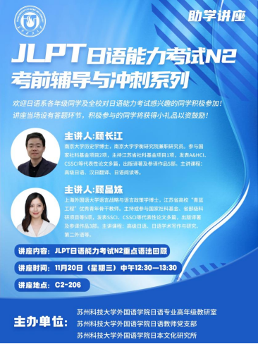 近日,日语系在C2-206教室成功举办了“JLPT日语能力考试N2考前辅导与冲刺”系列助学讲座。本次讲座由日语系高年级教研室的顾长江、顾晶姝两位教师主讲,日语系罗时光主任、刘嘉勇副主任,以及秦莉、王贝、李莲玉、郭璇等教师也参与了讲座。讲座对象为日语系大一至大四各年级学生,以及校内各专业选修日语课程的学生。