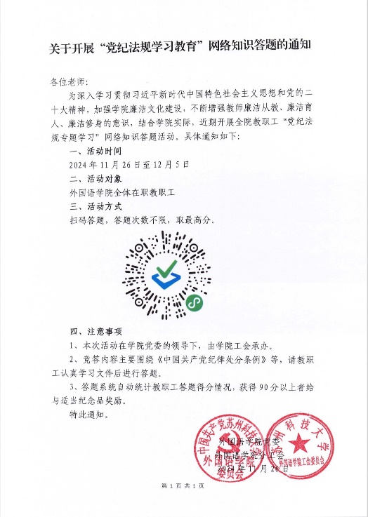 为深入学习贯彻习近平新时代中国特色社会主义思想和党的二十大精神,强化学院廉洁文化建设,提升教师廉洁从教、育人及修身的意识,外国语学院于 11 月 26 日至 12 月 5 日组织全院教职工开展了“党纪法规专题学习”网络知识答题活动。