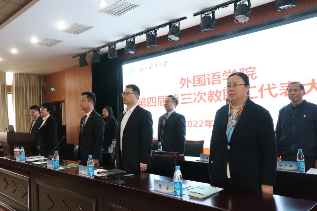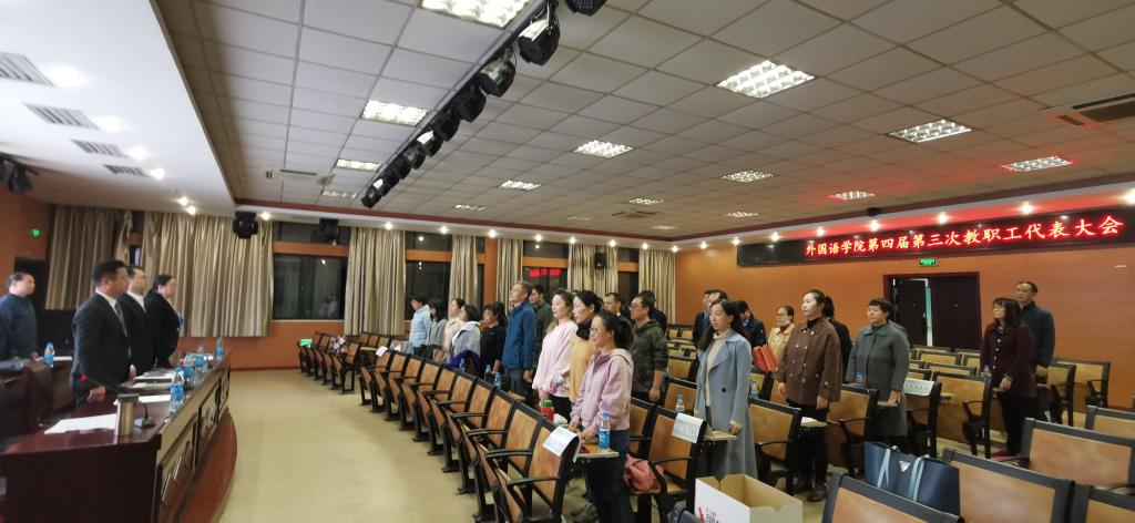 2022年12月6日15:30,苏州科技大学外国语学院在C2-5楼报告厅召开了第四届第三次教职工代表大会。参会代表共分为五个代表团,到场教职工代表共计51人。本次大会充分发挥了外国语学院教职工的主人翁精神,促进了学院管理的民主化和科学化,推进学院的健康快速发展。