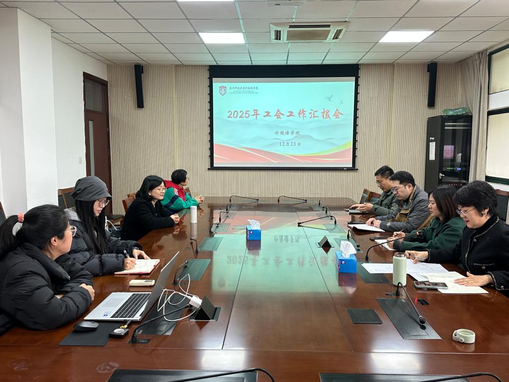 12月23日中午,外国语学院2025年度工会工作总结汇报会在学院楼C2-308会议室顺利召开。学院党委副书记(主持工作)李敏、副院长(主持工作)綦亮、党委副书记李思为出席会议,院工会主席刘芳、全体工会委员及各工会小组长参加会议。会议由工会主席刘芳主持。