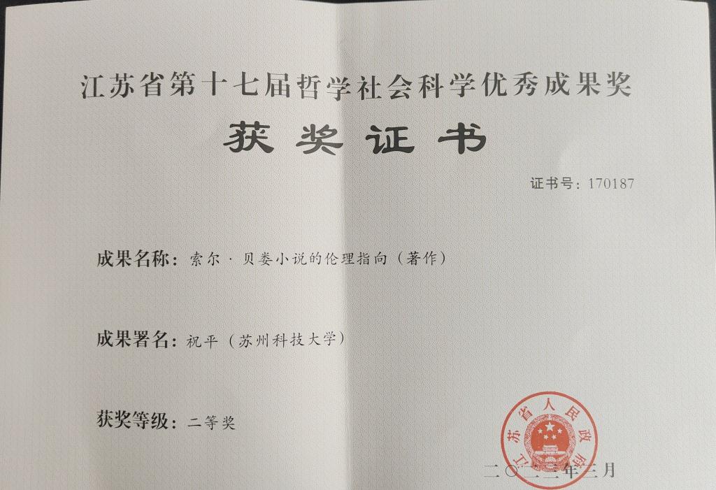 日前,江苏省人民政府公布了江苏省第十七届哲学社会科学优秀成果奖获奖名单。我院祝平教授的著作《索尔·贝娄小说的伦理指向》获二等奖;柯英教授的《苏珊・桑塔格:大西洋两侧最智慧的人》,作为普及成果《女性天才·生命、思想与言词系列》 (共八册) 之一,获二等奖;郭雯副教授的著作《克隆人科幻小说的文学伦理学批评研究》获三等奖。本次获奖,充分展示了我院外国文学研究团队的整体实力,为我院学科建设提供了有力支撑。