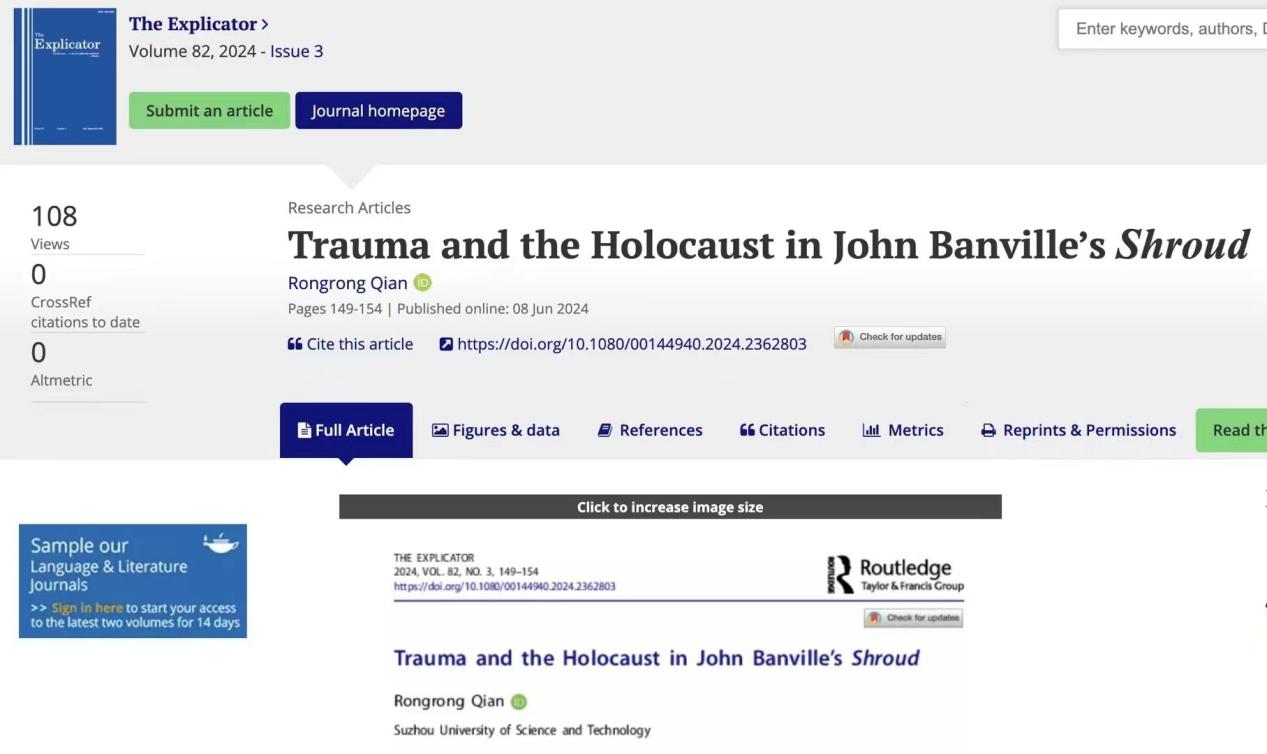 近日,我院英语系钱蓉蓉博士以第一作者在国际知名期刊《The Explicator》发表研究论文《Trauma and the Holocaust in John Banville’s Shroud》。该论文聚焦爱尔兰当代作家约翰·班维尔的《裹尸布》(2002),通过分析小说中平行的叙事结构、重复的燃烧意象以及历史现在时的使用,阐明德·曼式解构主义与创伤叙事之间的联系。