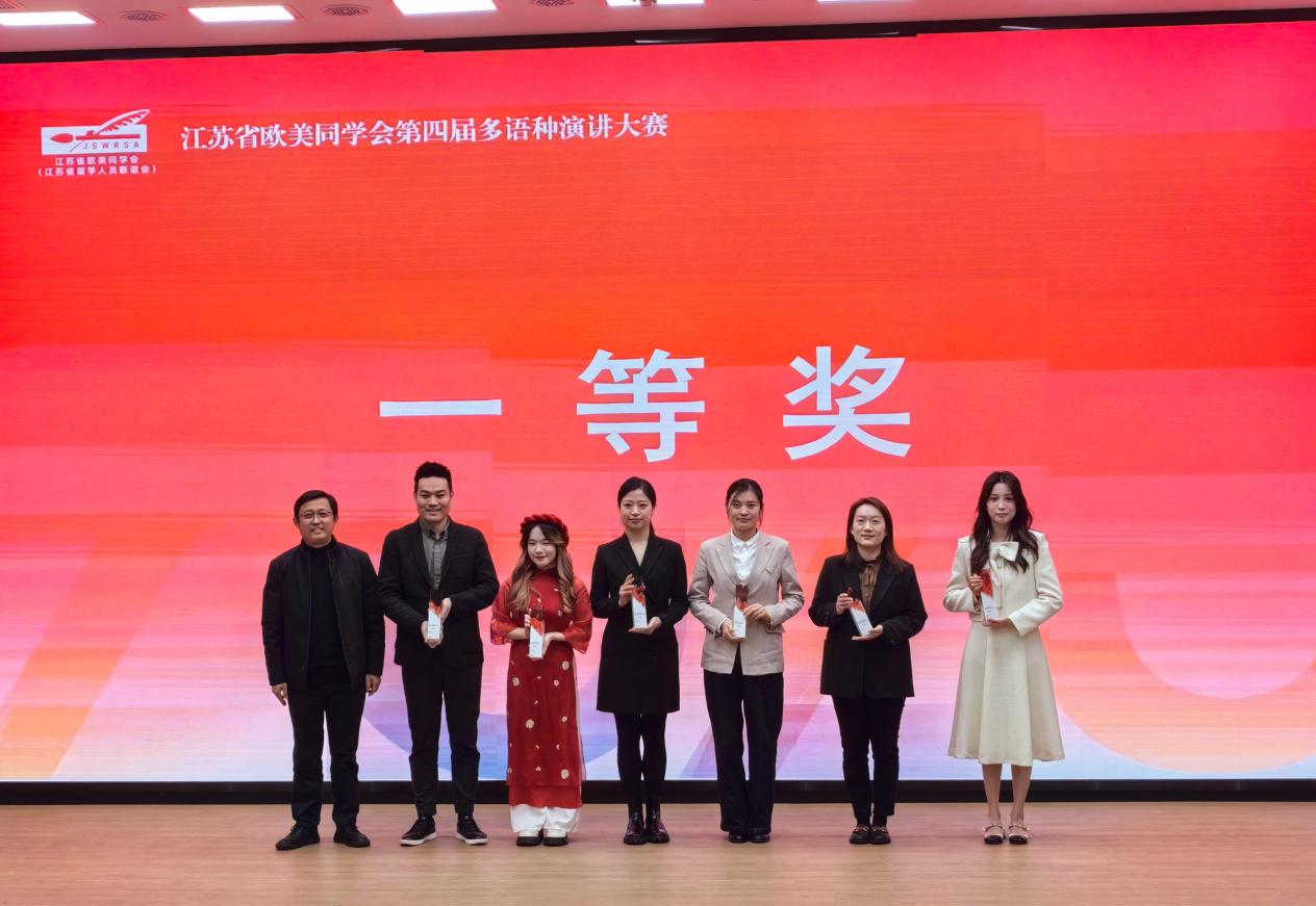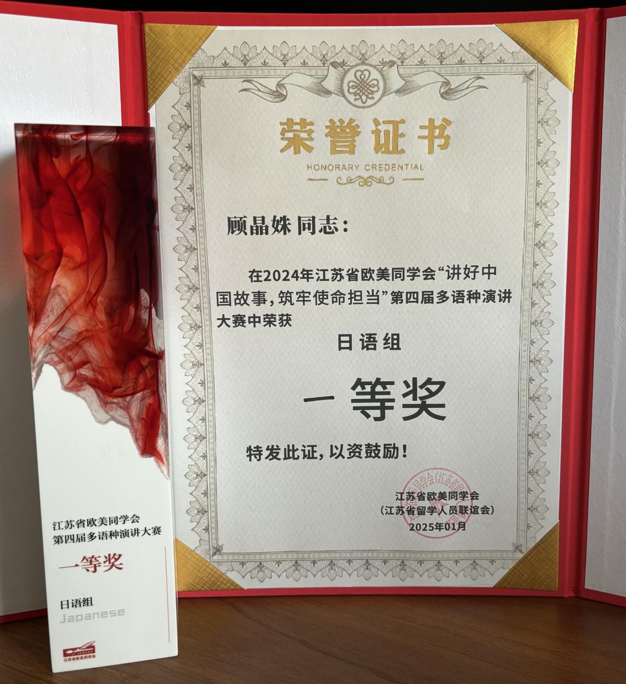 2025年1月4日,江苏省欧美同学会第四届多语种演讲大赛在南京隆重举行。由我校党委统战部、苏州市欧美同学会、苏州科技大学欧美同学会指导并推荐的外国语学院顾晶姝老师参加了日语组的比赛,其演讲题目为《緑の未来——中国から世界へ発信すること》(绿色的未来——中国向世界传递的讯息)。凭借出色的表现,顾晶姝老师名列日语组第一名,斩获一等奖。