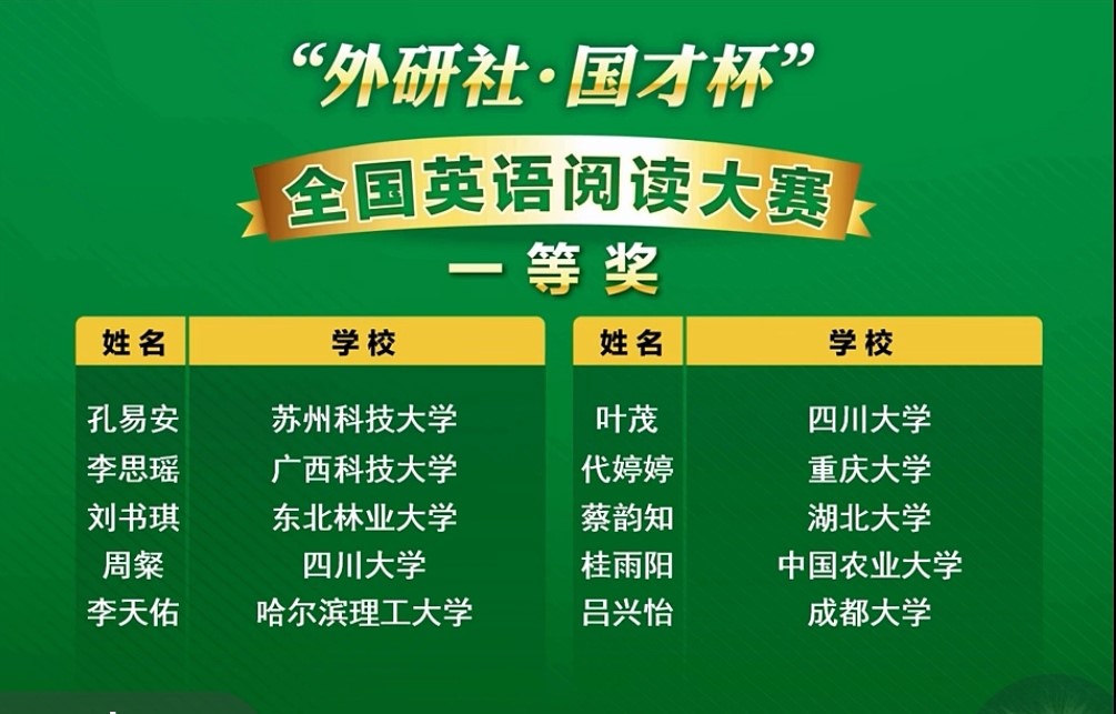 近日,“外研社•国才杯”全国大学生英语挑战赛全国总决赛成绩揭晓,来自30个省、市、自治区及澳门特别行政区的大学生以及在华留学生共916所院校56万余名学生参与,经过激烈角逐,全国共123人(每省3个名额)进入总决赛,最终评选出全国一等奖20项。我校由外国语学院指导教师团队王妍、冯滢、杨婕三位老师指导的孔易安同学,喜获全国英语阅读大赛一等奖。此外,我校学生在江苏省赛中获得一等奖3项,三等奖4项。