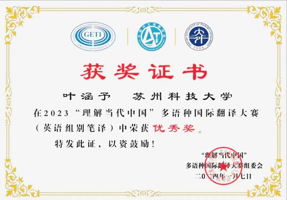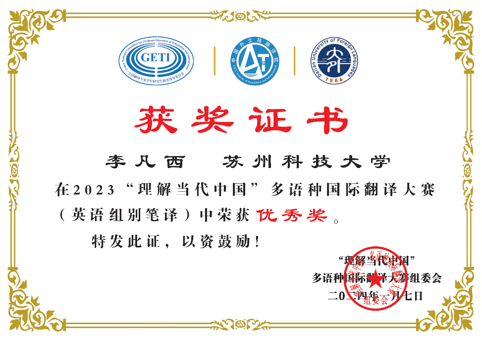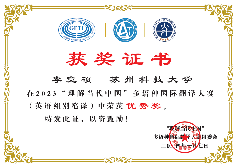1月22日,“理解当代中国”多语种国际翻译大赛的优秀成绩揭晓,我院英语笔译专业研究生李竞硕、付铭婧、李凡西、马严言和叶涵予同学在英语组汉译英赛项中斩获优秀奖,为我院赢得了光荣的成绩。